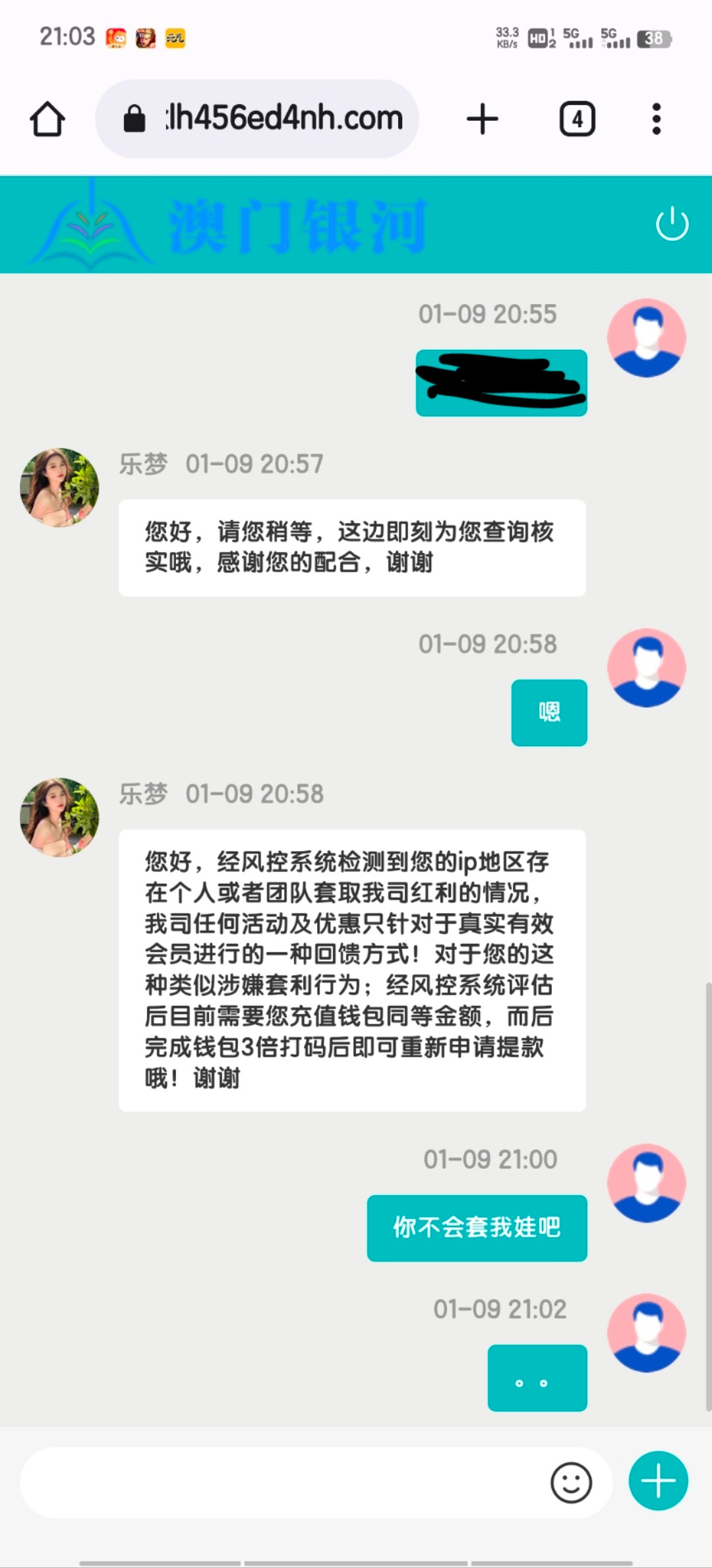 有没有老哥在玩这个台子,我从18年开始玩没被黑过,今天玩的居然说我不能单边下注,和不能一直下注同一个号码,充的26提200半小时没到然后上去看,发现任何游戏都不能玩相当于封号了,我就去问客服就发生我上面说的那样,还让我保证下次不这么下注,关键我以前也都是这么玩的没事,这次被警告了搞得我以后都不敢在这个台子充值了,我一直玩的是bb彩票,我保证了给我出款了