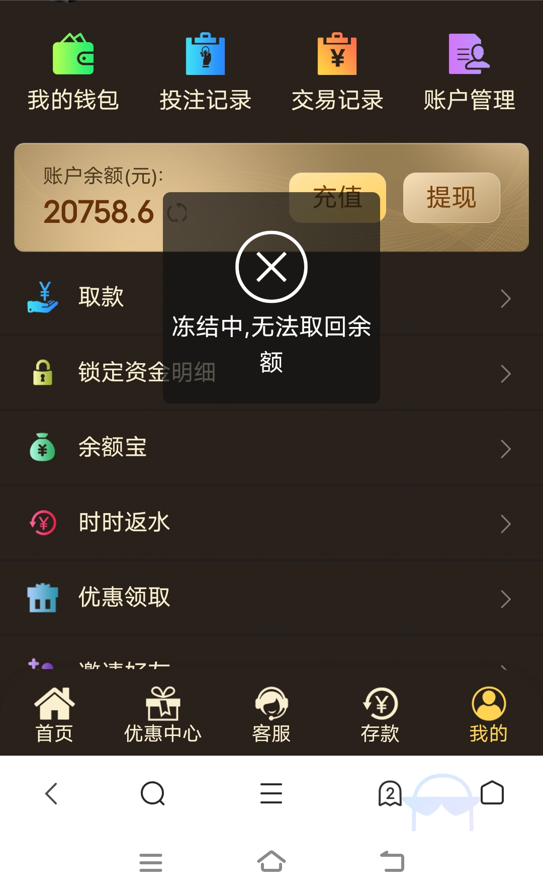 充了1w4,2w给我黑了,冻结余额,能登录就是不能取款和游戏,叫澳门威尼斯人,002a.com这是网址,以前总共加起来提了9k这次充多了直接黑了我