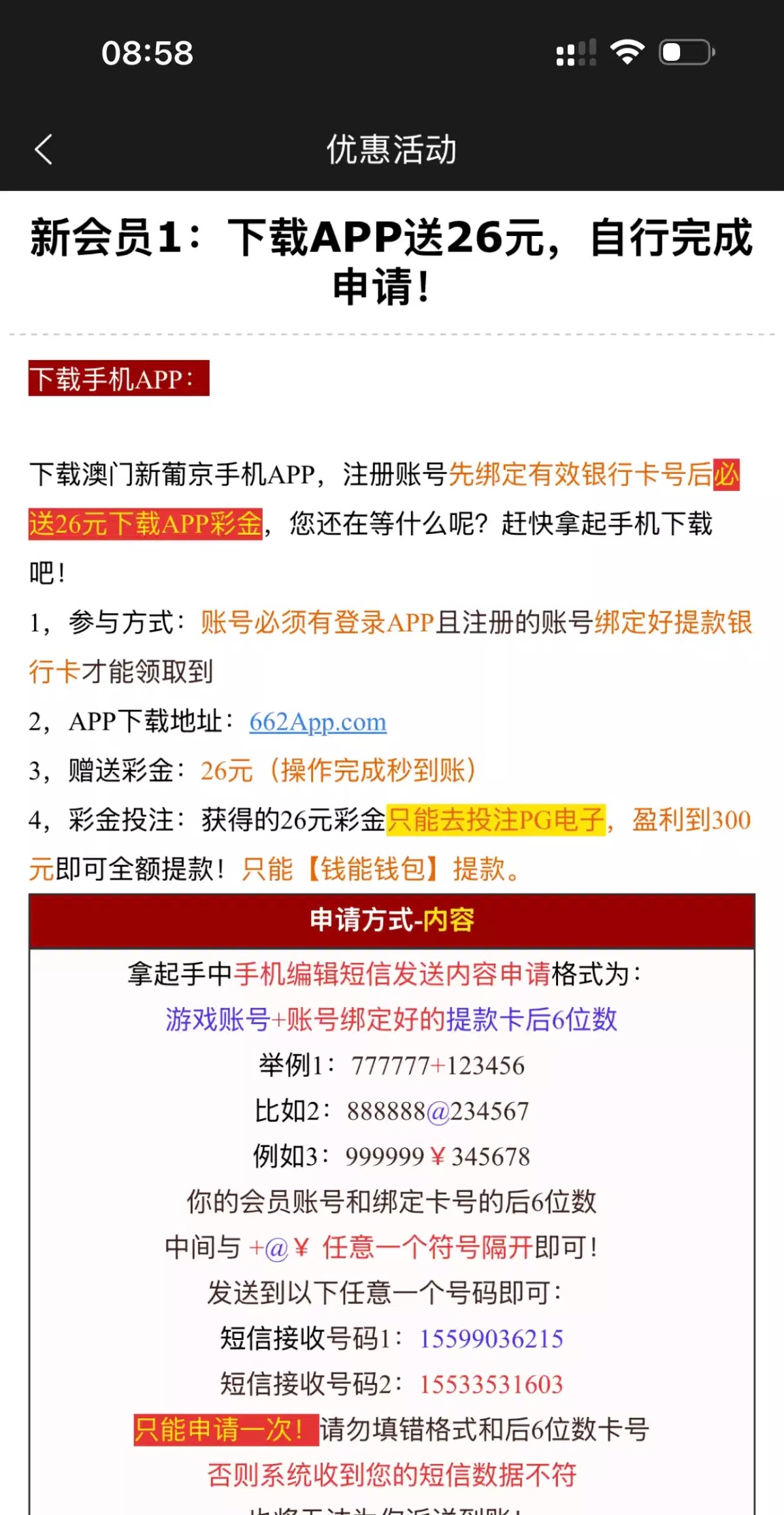 妈的垃圾台,中午接电话说登录领彩金,上去没有,找客服变成回归存送了。我去年还输一万多呢。