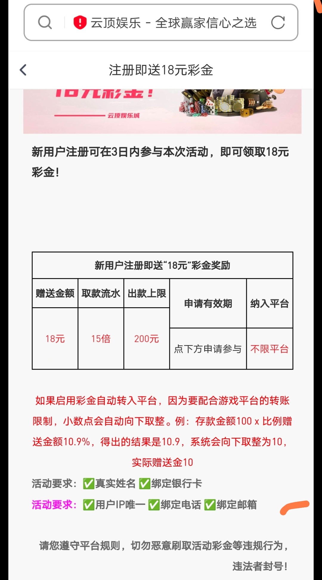 新用户注册绑卡绑定手机号/邮箱地址优惠大厅自助领取18彩金