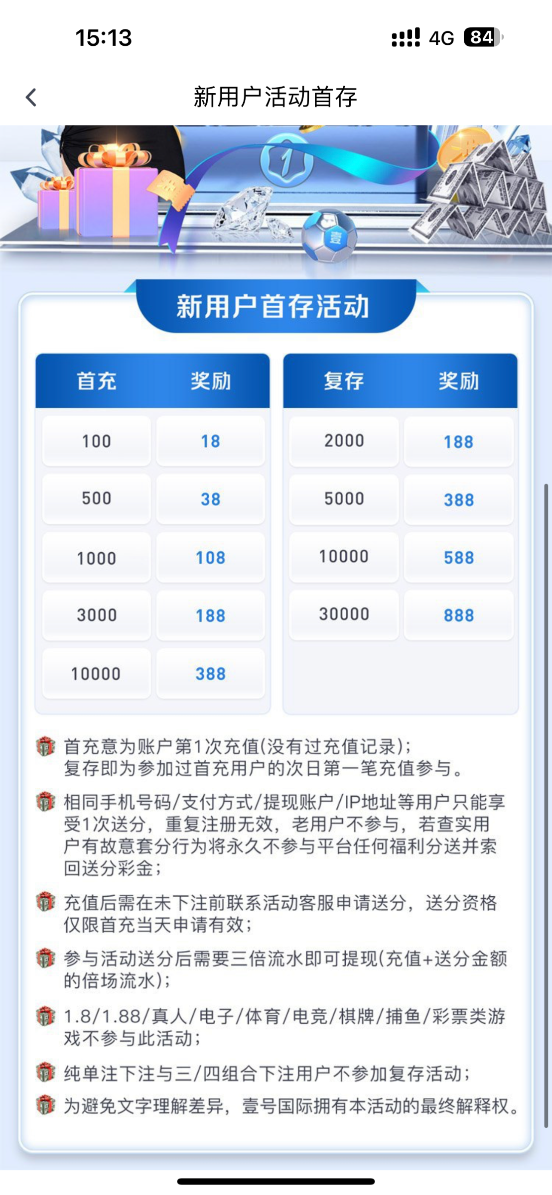 活动:新用户首存100+100(只能娱乐电子游戏,井且满足10倍流水即可无限制提款或者最低提款588元)首存活动只能参加一个参加100+100其他首存活动都无法参与,本活动仅限独立账户参与,如同一姓名、同一手机号、同一IP.同一银行卡账户多账户均不参与,该活动需要在未下注前申请