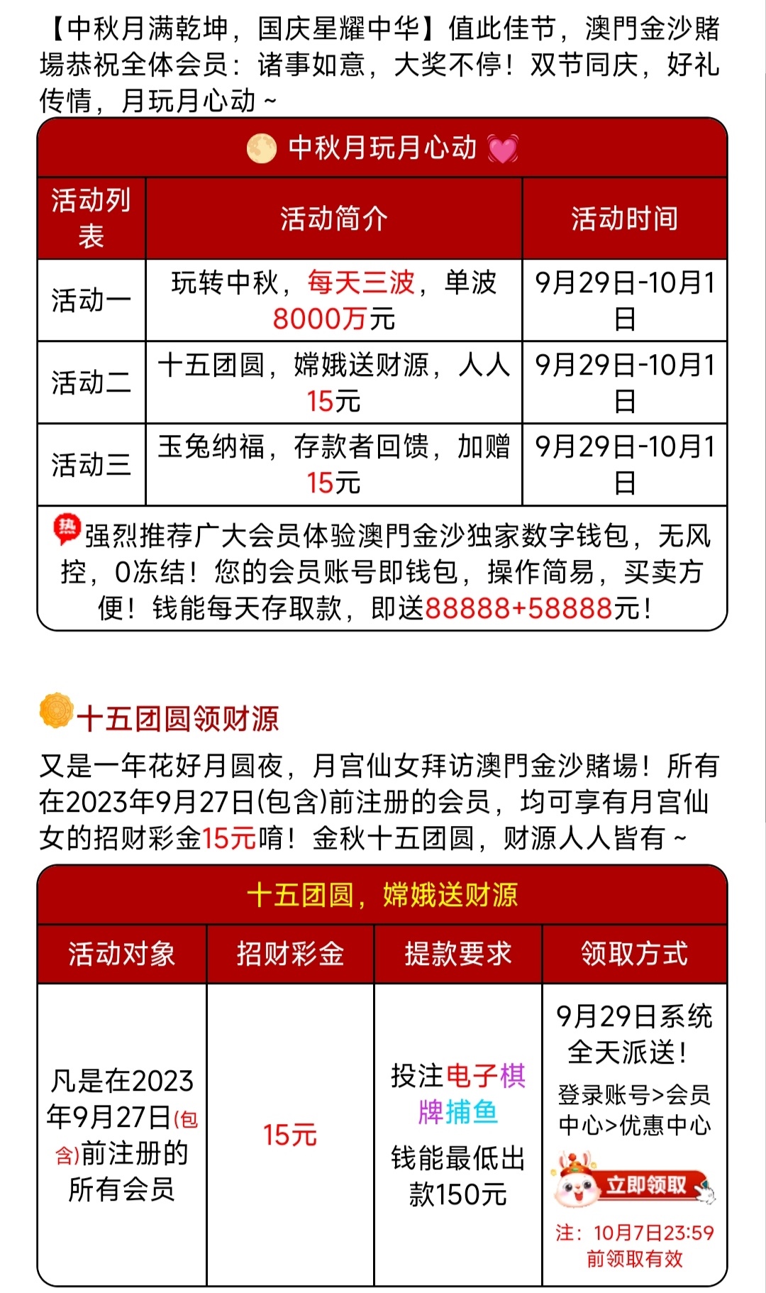 老用户中秋节期间回馈15,详细介绍看活动。