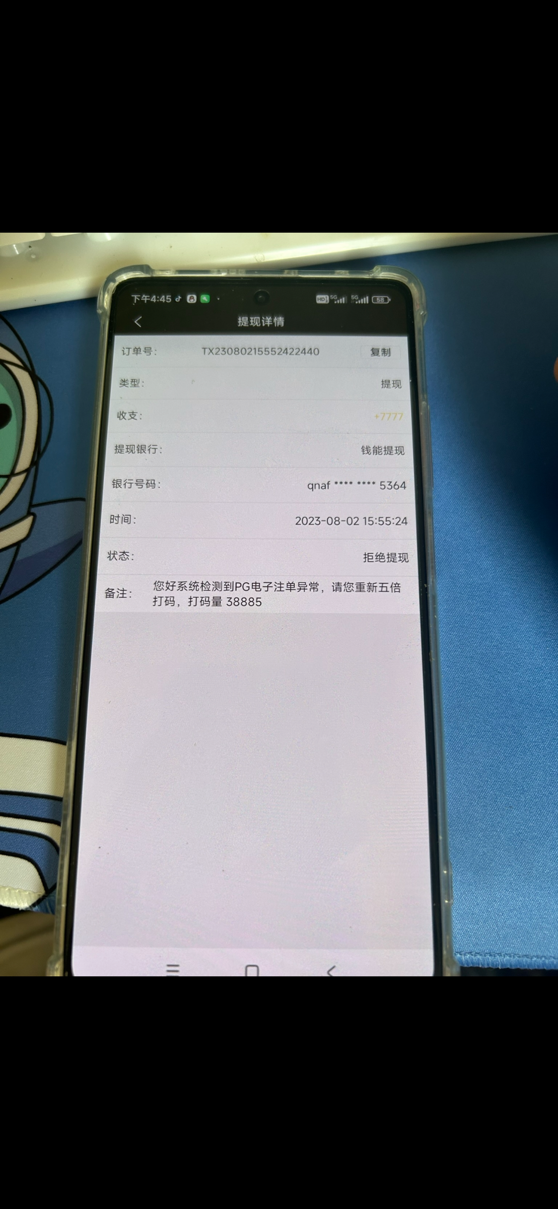 精彩网这个老6,充值100打pg提款驳回,提示警告一次,经常流水过低,找客服问了一下,提款驳回得图都给我改了变重新提交了,前几年玩过等级v5,好长时间没玩了以前玩的AG飞禽走兽,百家乐,今年五一送了288打到了两千多还了借呗,没想到提款给出了。这个台子玩的老哥千万注意,赢个几千,上万提现问很难,几十万直接黑,前几年一个同事玩刚开始还好陆续赢了几万,后面一次充值了一万提现一万过点,被罚了10倍流水,结果流水打够了