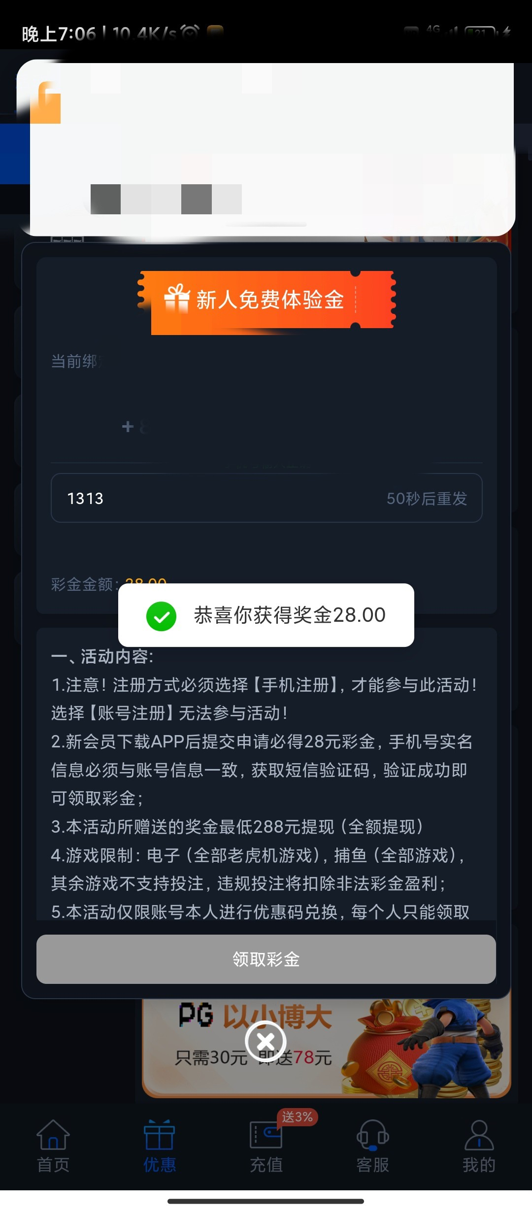 新用户注册优惠自助送28/288提现 老用户可以自己试试。