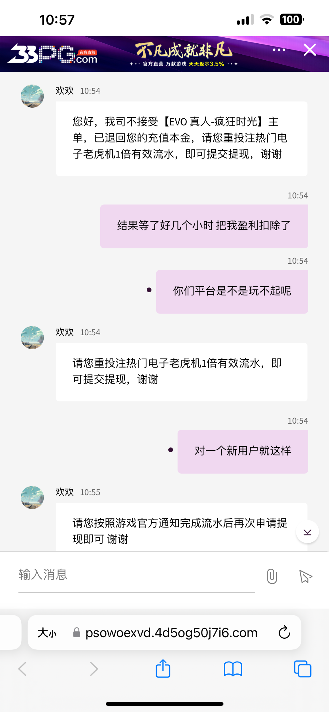 避雷33pg.com,冲了一共2700,提款7650直接黑款,理由不接受此注单,提款的时候联系客户,客户说财务正在处理出款,然后过了一小时半,确实处理出款了,给我盈利的钱扣掉了,给我退1000本金,让我强制玩电子,并且重新打码一倍流水,就因为在他们平台是新用户,没有负盈利,玩转盘进了个100倍,不敢给出款,一点格局都没有的平台大家记得避雷,去其他平台今天输一万,果然还是黑台好赢钱,现在赌的我真犯恶心,输的时候一直输,赢的时候各种理由卡你款,网络赌博就是诈骗,冲了不一定赢,赢了不一定给,给了不一定出,出了还冻你卡,恶心至极,当冲钱让大家见识一下黑台了,一定记得避雷,帮忙骂客户的留下收款码给你们红牛
