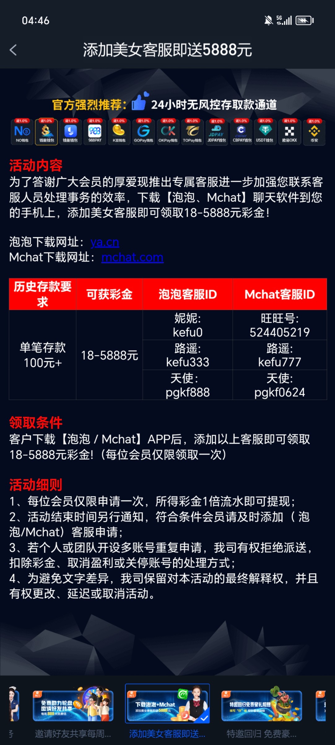 这种台加泡泡客服都能领18彩金,我三个都领到了,你们自己去试试,下面三个台都有这个活动赶快去试试吧,领不到一个总会领到一个