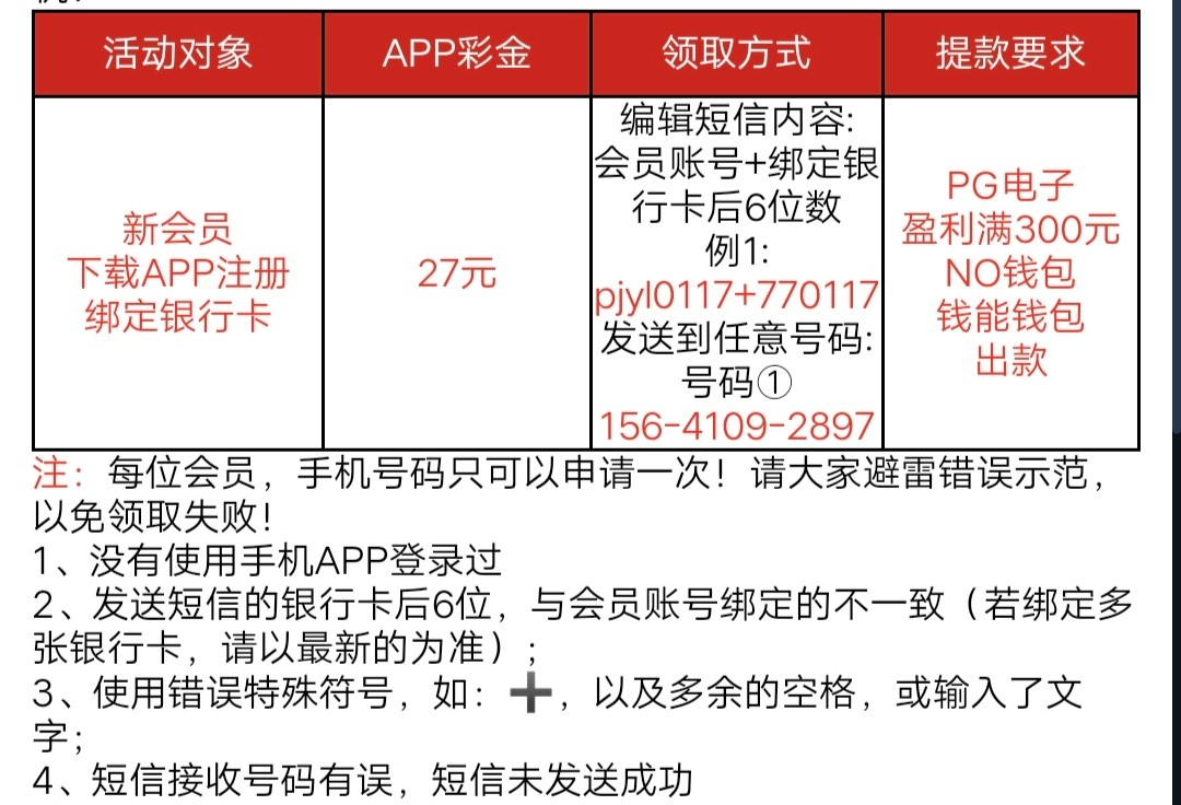 新会员下载APP注册绑定银行卡,发送短信申请27元APP彩金,限制PG电子,盈利满300元,NO钱包钱能钱包出款,没申请过的老哥可以试试,不给问下客服,实在不行无视就好了。