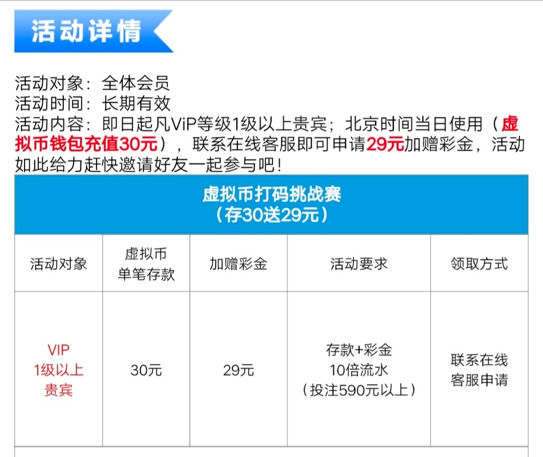 ViP等级1级以上贵宾;北京时间当日使用(虚拟币钱包充值30元),联系在线客服即可申请29元加赠彩金,存款+彩金10倍流水(投注590元以上)出款,具体看规则介绍。
