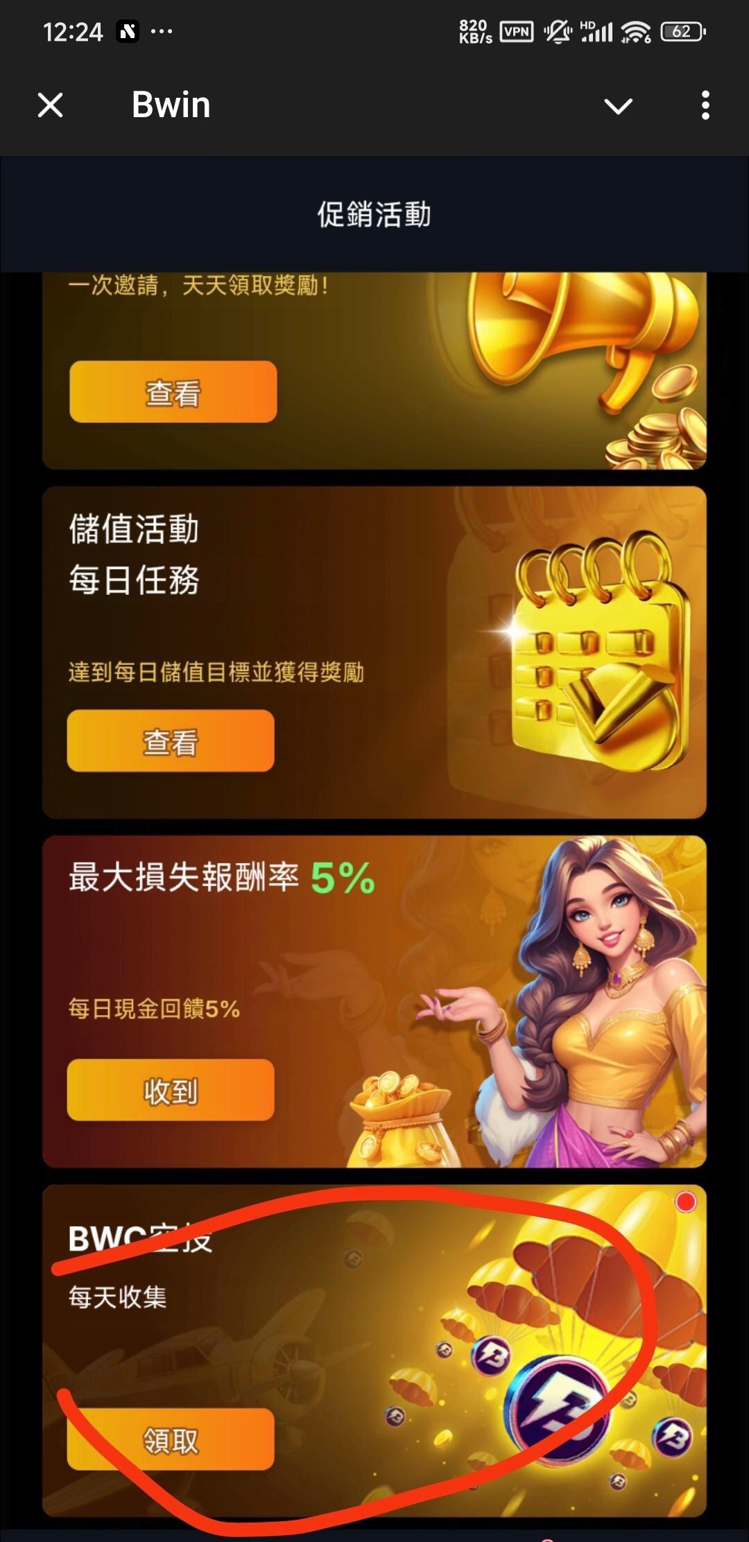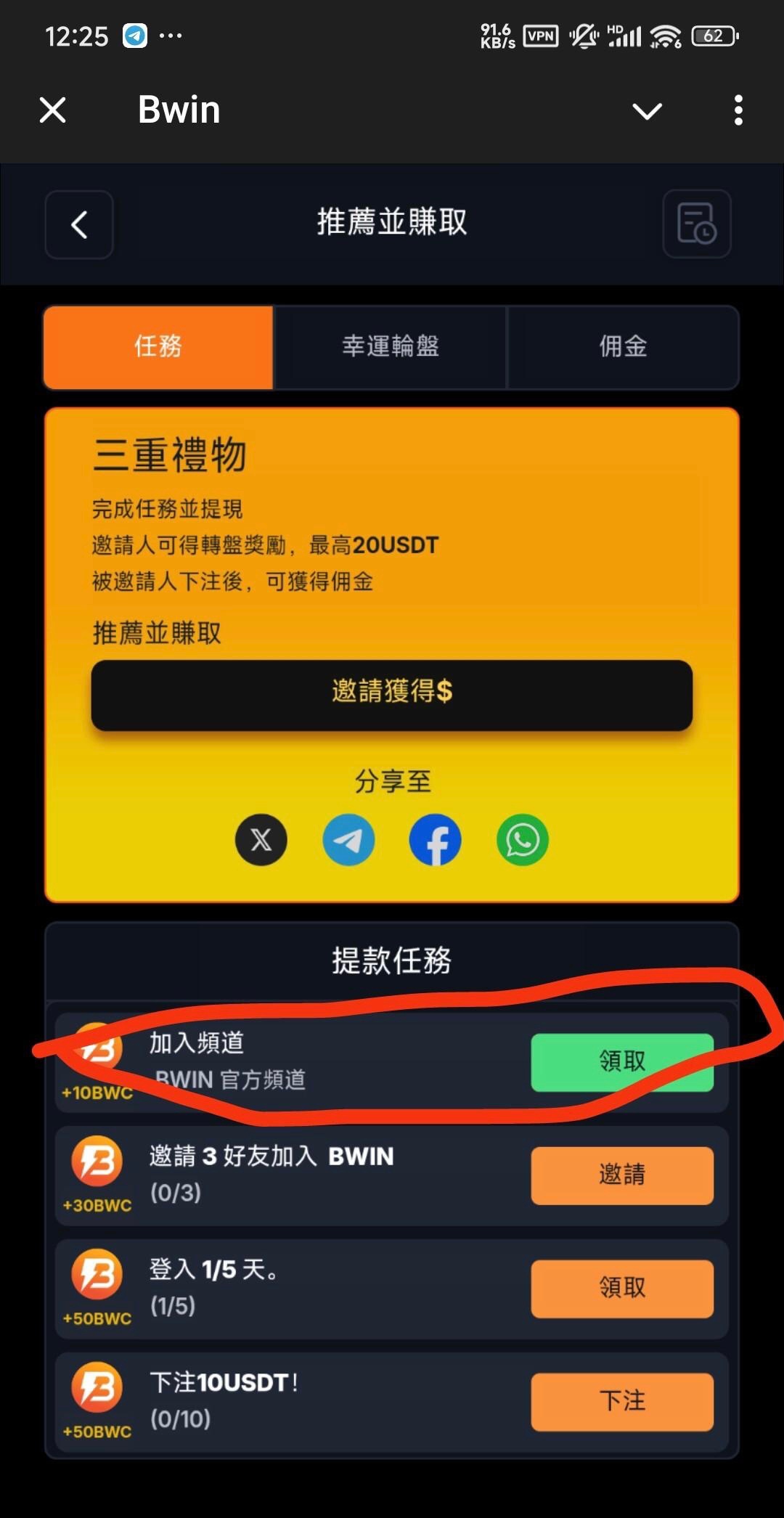 机器人@bwin,注册账号登录,点最下面促销活动,点第三个分享并赚取,然后加入频道返回领10,活动每日空投领3