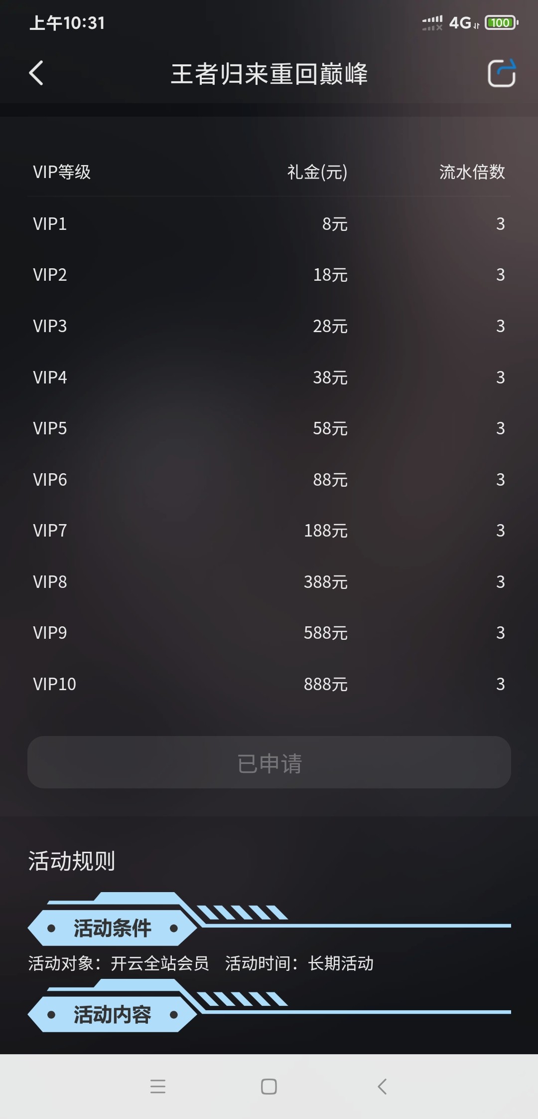 活动里自己领,不审秒到。不充值最多提彩金3倍。不能彩票。