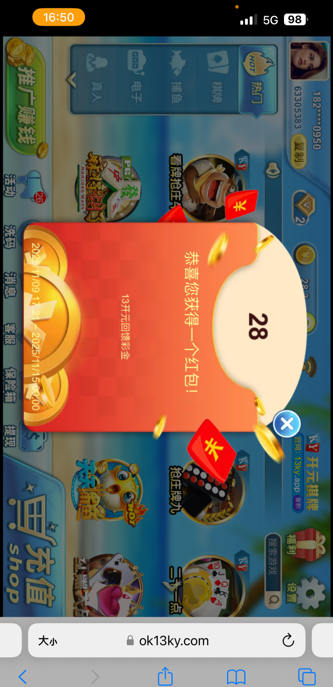 接到电话 登陆领了28。之前有账号的上去看看,网址:13ky.co
