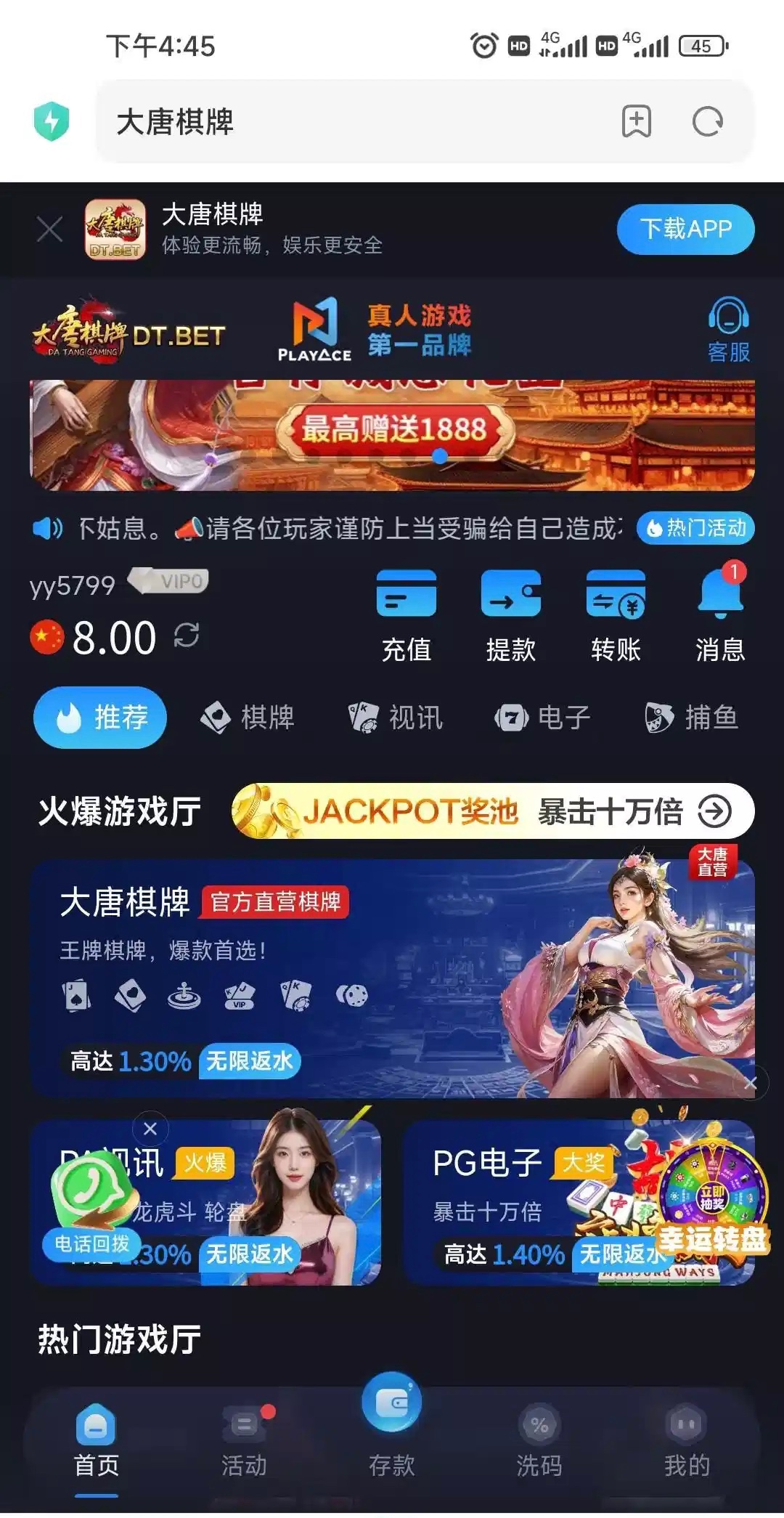 我是接到电话了,进去找客服,就说接到电话j6国际和大唐合并了,接到电话送彩金,8元。DT.BET