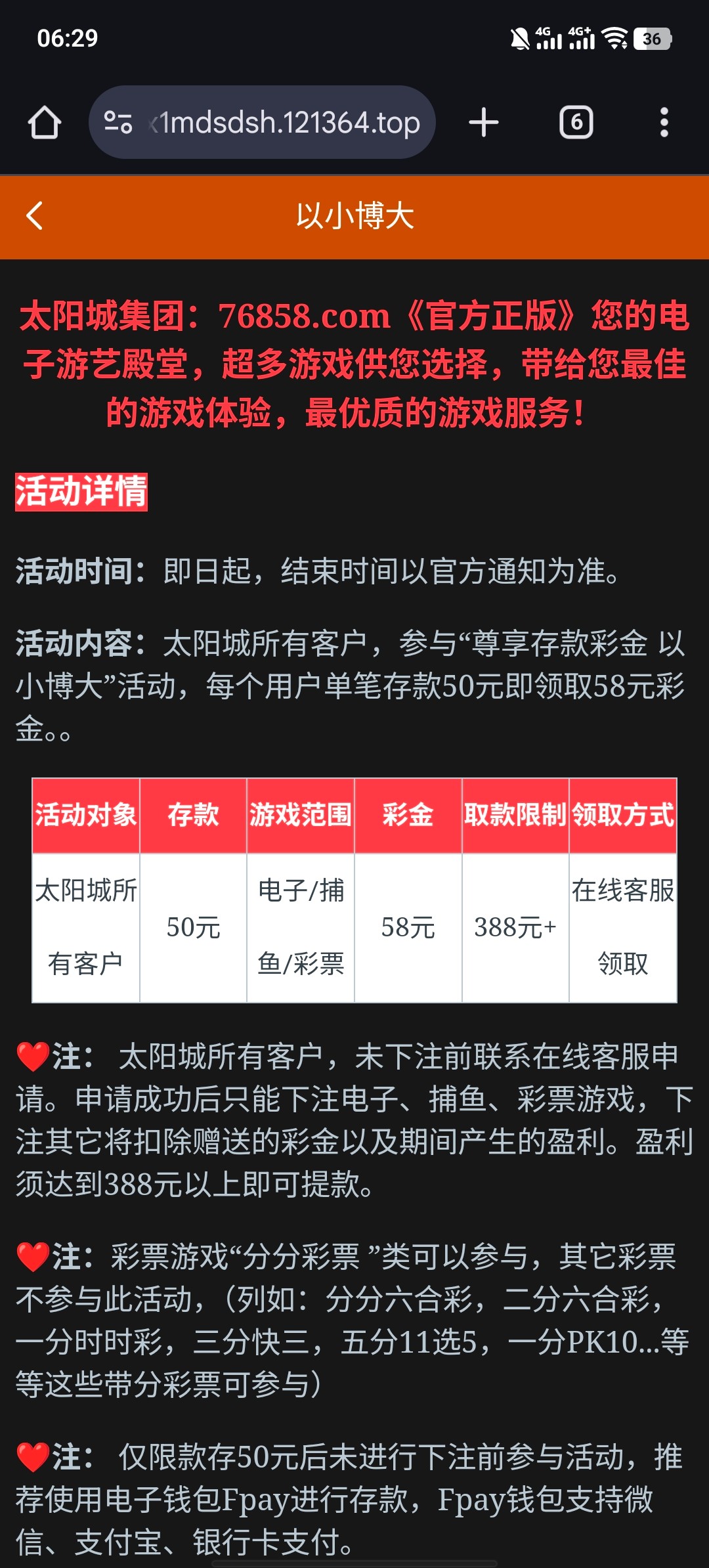 活动内容:太阳城所有客户,参与“尊享存款彩金 以小博大”活动,每个用户单笔存款50元即领取58元彩金。。