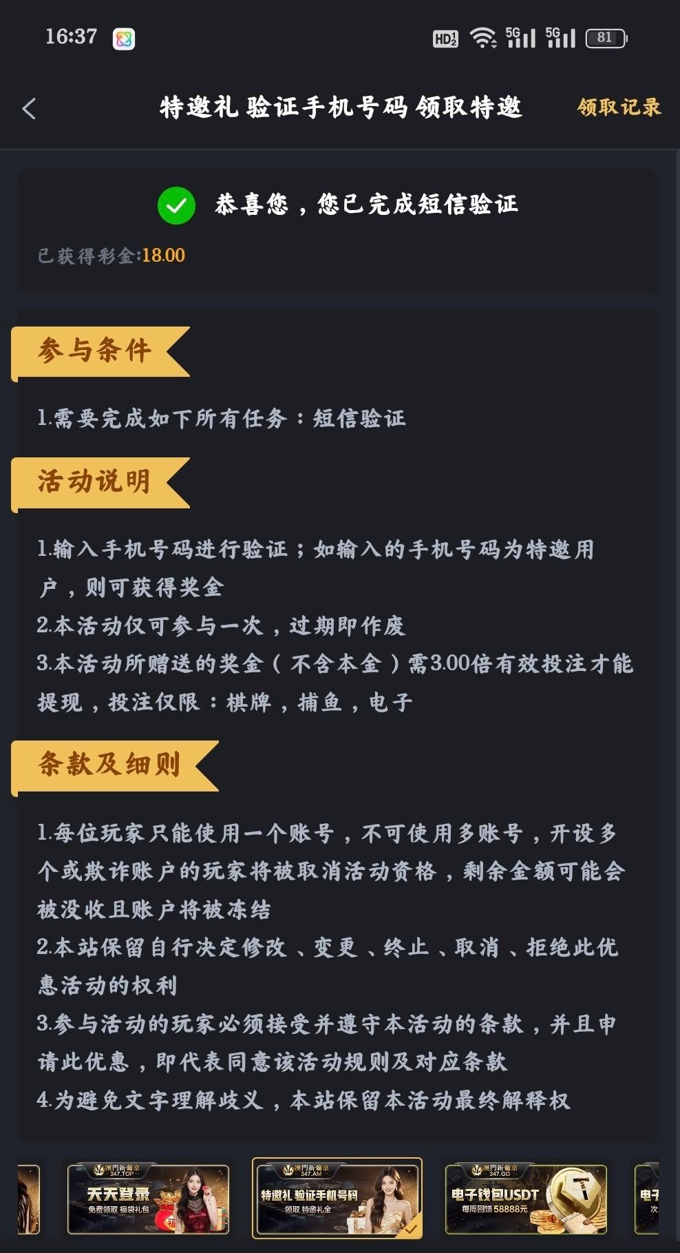 碰瓷18彩金 接到电话活动自己申请18