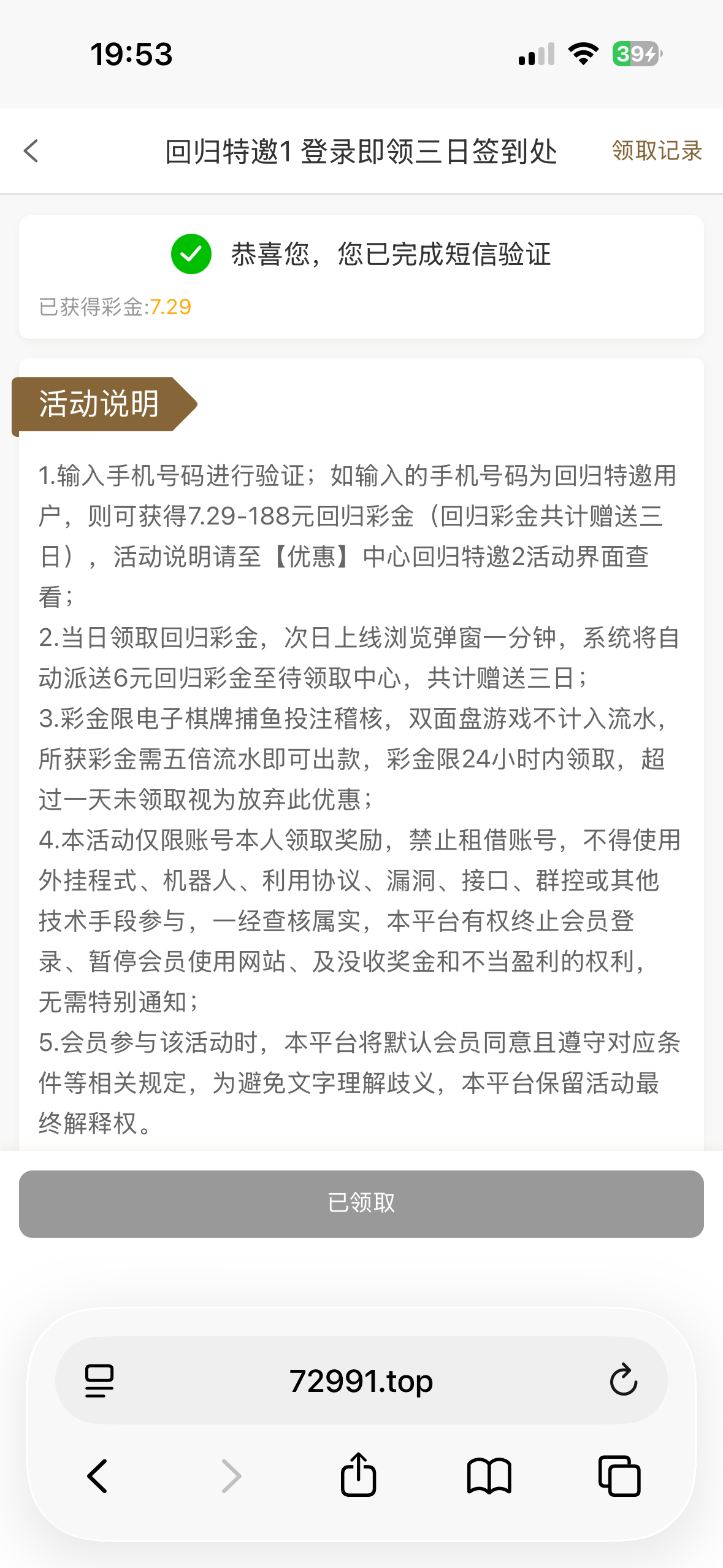 【银河72991】老用户回归彩金领3天