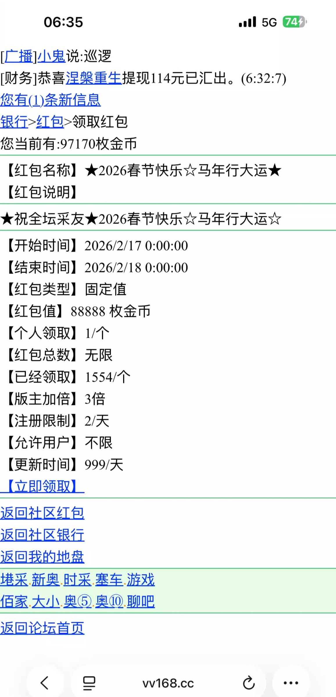 登陆去论坛找到马年红包 领取88888金币 出款不知道黑不黑 我没打出来 链接:vv168.cc