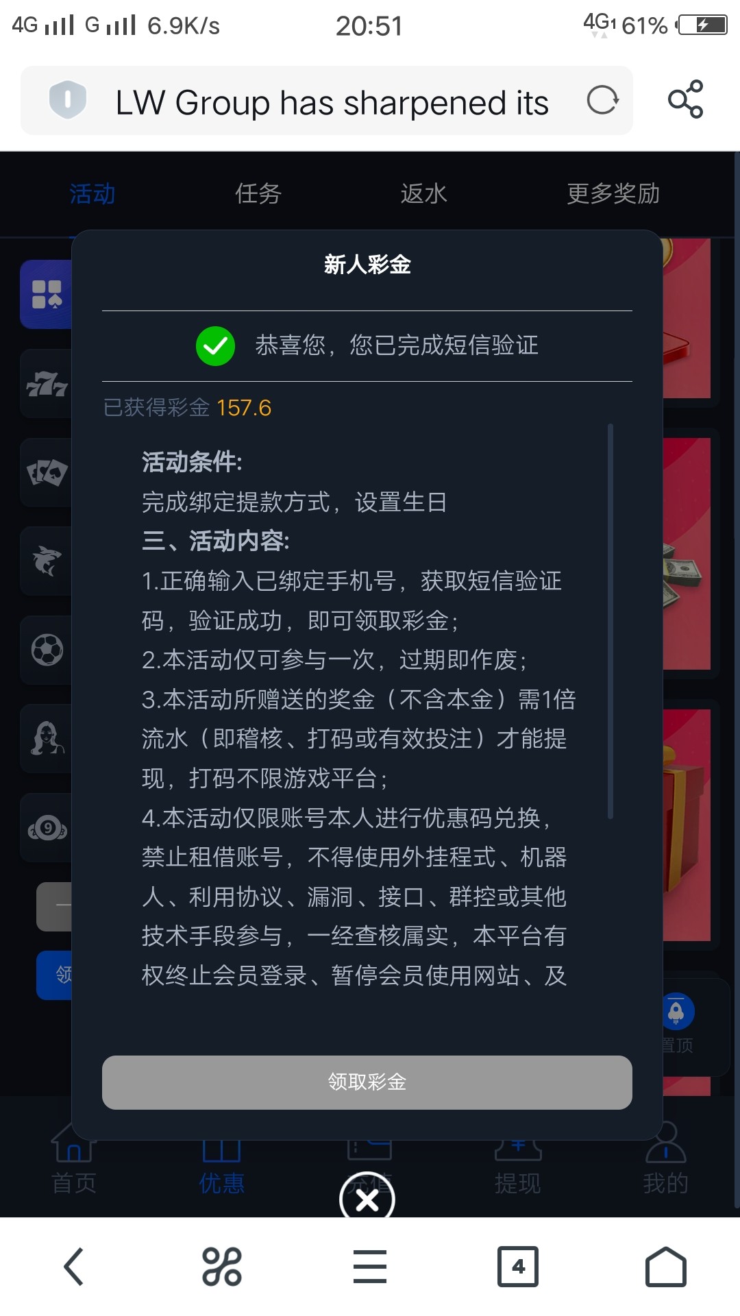 楼主是狗代来的,领了手机号彩金,最低要充500,打一杯流水才能提现,拉人头明显是割一波韭菜收网