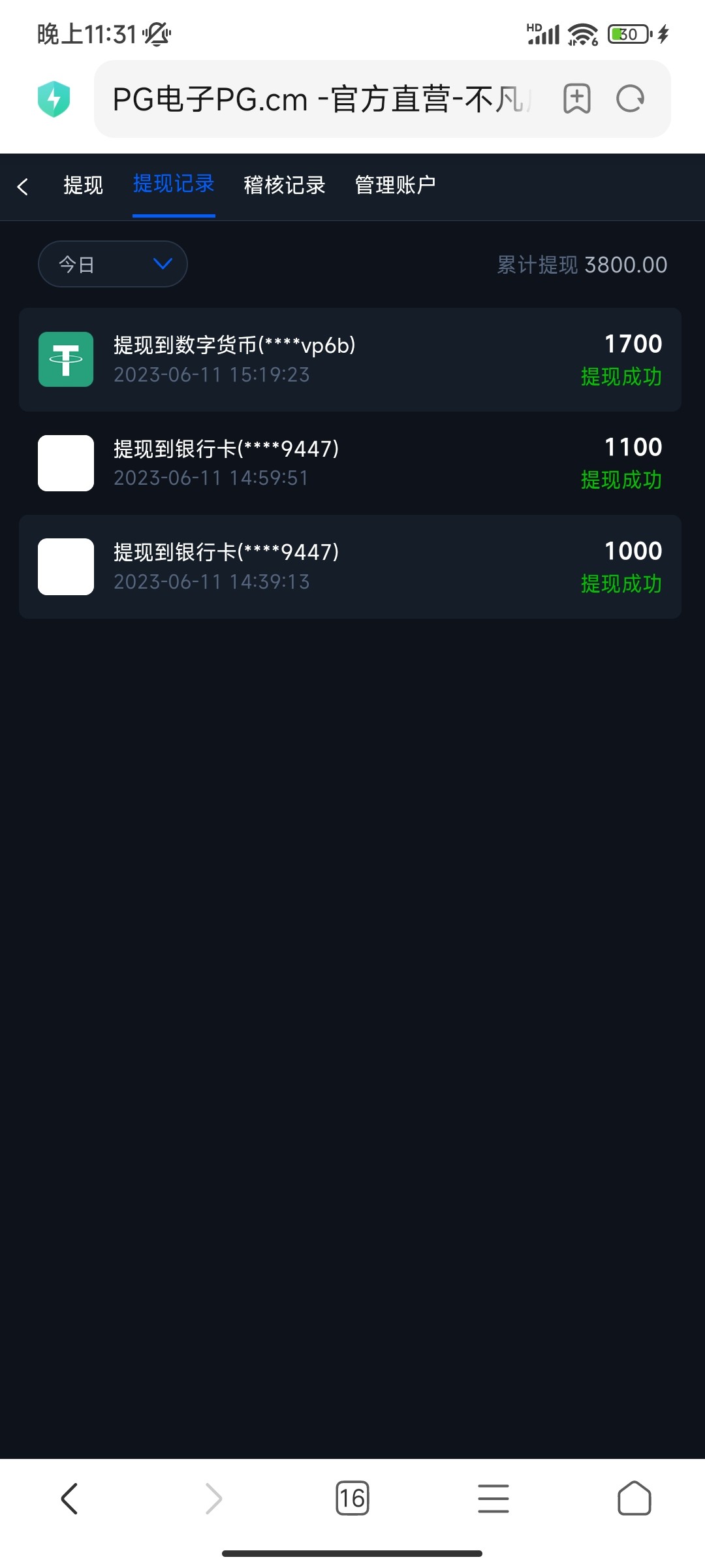 提现三次,一次1000和1700都到账,但是中间一次1100显示到账,可我没收到钱,大家知道咋回事吗?是不是黑了