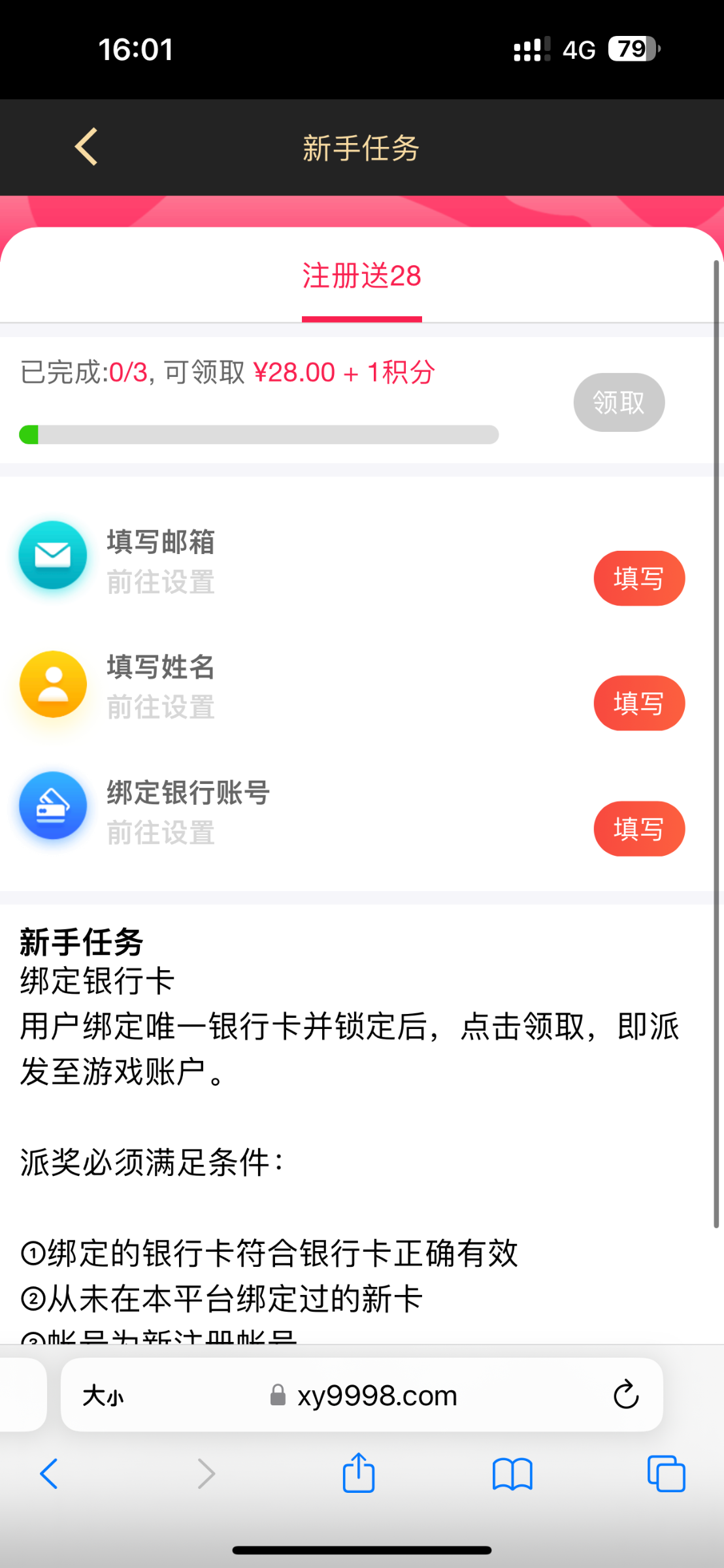 新用户注册点击会员中心 然后再点击奖励中心-新手任务 绑定完信息之后领取28即可  提款自测